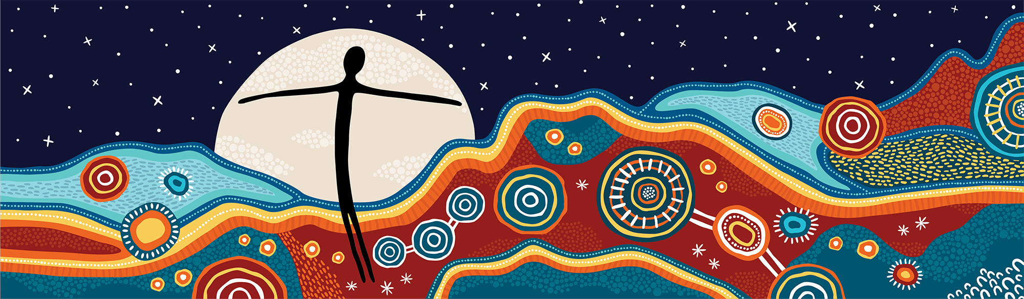 In 2024, ALSWA’s new-look branding was unveiled. It featured a new logo and accompanying artwork titled ‘Sovereign Spirit’. The artwork features a spirit figure presiding over a vast West Australian landscape imparting wisdom and upholding justice. The figure is framed within a full moon against a celestial night sky, guarding three interconnected circles which represent Criminal Law, Family Law and Civil Law.